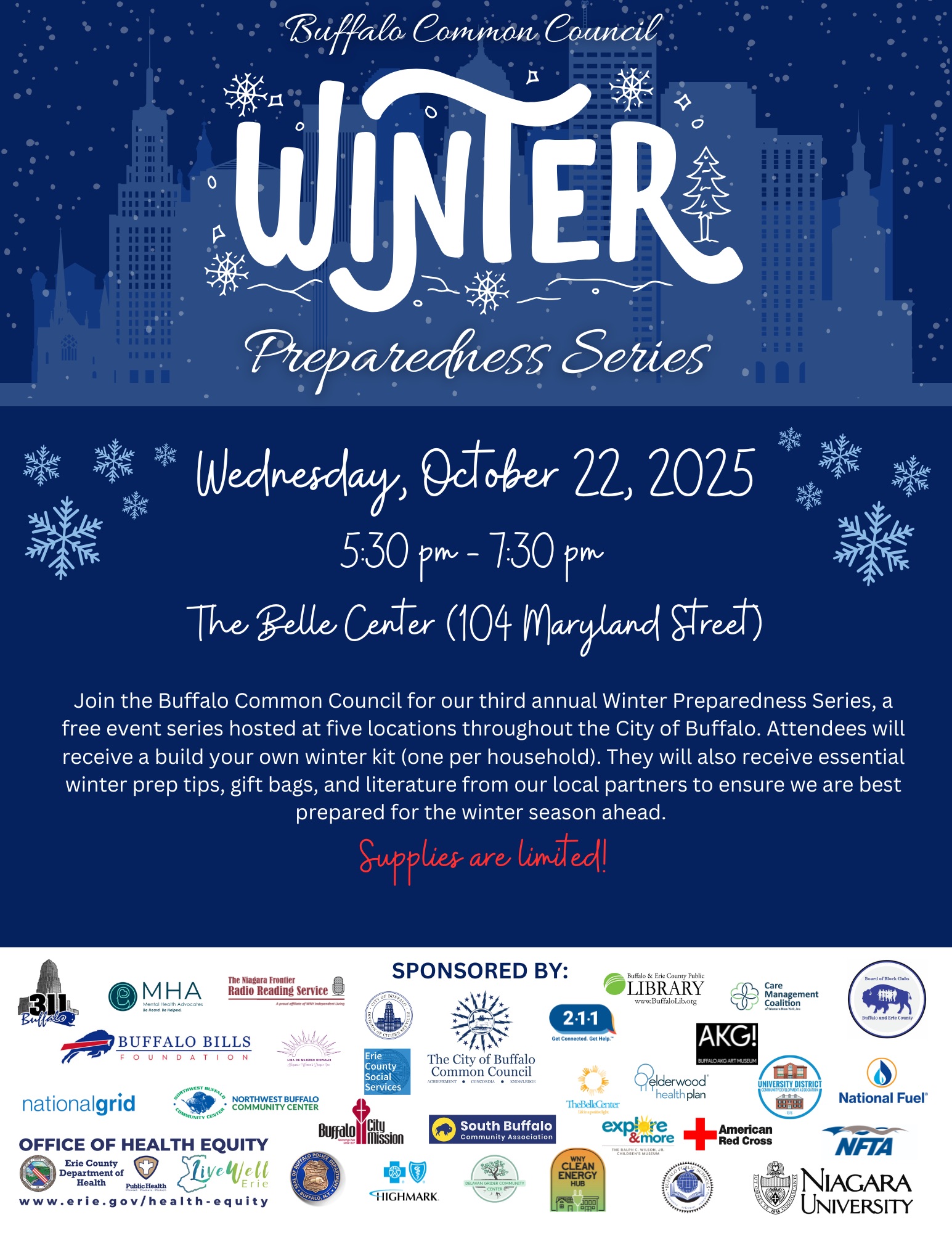 The Belle Center 104 Maryland Street, BuffaloThe Belle Center is proud to host the Buffalo Common Council’s third annual Winter Preparedness Series, a free community event designed to help Buffalo residents get ready for the colder months ahead. Join us for an engaging, family-friendly program featuring: Build-Your-Own Winter Kits (one per household) Winter safety tips and seasonal resources Gift bags, information, and